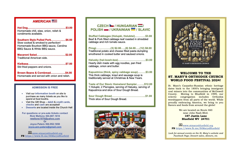 The World Food Festival is an annual event of our parish. It is a celebration of various cultures represented in our church. It is an opportunity to present the food, music, and traditional dress of these cultures to the community.
